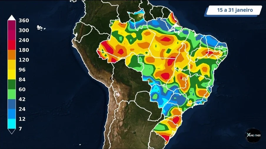 Janeiro ainda deve registrar muita chuva pelo Brasil. A partir da próxima semana, a precipitação acumulada pode passar de 100 mm em diversas áreas produtoras nas cinco regiões do país (manchas em amarelo e vermelho no mapa acima).