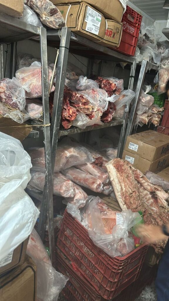 Durante a fiscalização a Polícia Civil apreendeu na primeira câmara 1.081 quilos de carne bovina, armazenadas, 212kg de linguiça artesanal produzidas sem SIM, bem como 41kg de coração de boi e 41kg de frios.