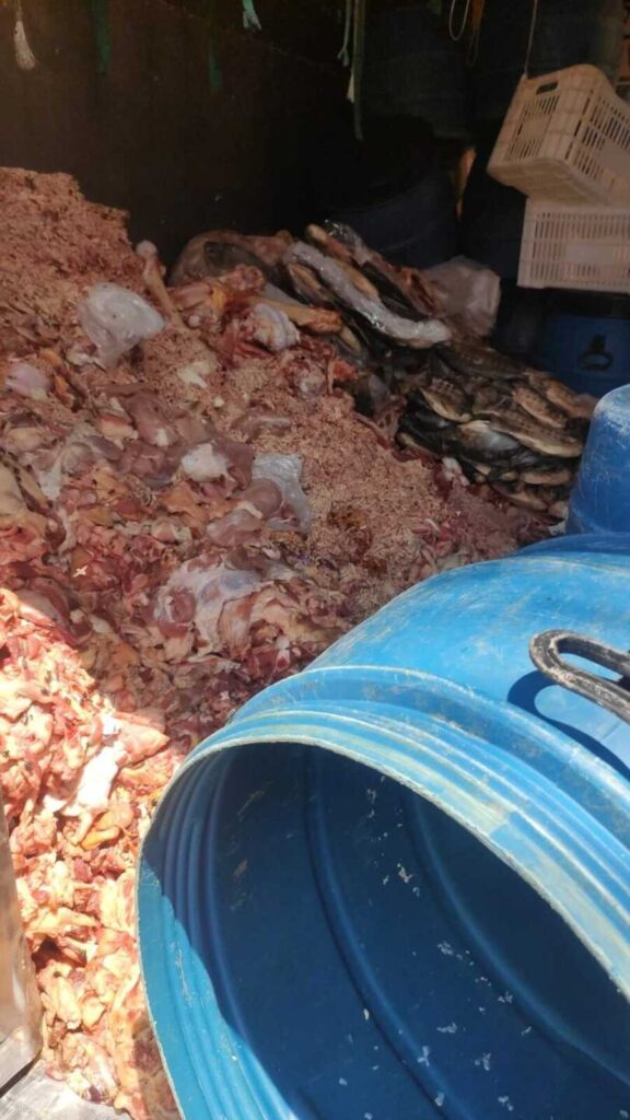 Na segunda câmara fria, 272kg de carne suína, já sem as características organolépticas, 235 salsichas, vencidas a mais de três meses, 58kg de frango, 32kg de calabresa e 538kg de peixes com vísceras oriundos de produção clandestina.
